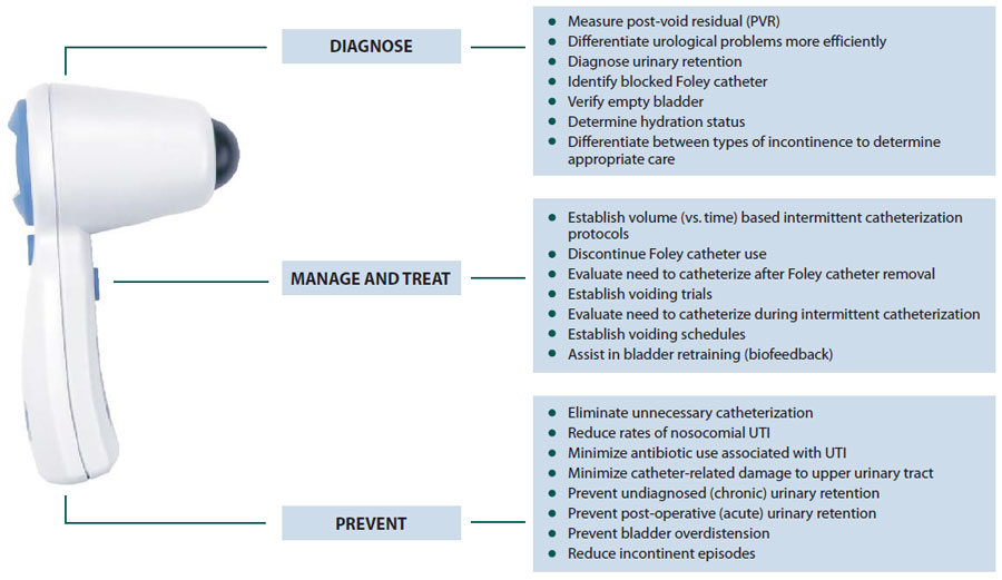 Because they are noninvasive and easy to use, BladderScan® instruments are an excellent alternative to diagnostic urinary catheterization and a perfect tool to help healthcare providers noninvasively diagnose, manage and treat urinary outflow dysfunction. |